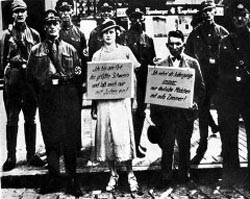 Mens vi var i Kaliningrad skjedde det en episode jeg aldri har kunnet glemme. En dag kom en kvinne i 30-årsalderen spaserende gjennom byen. Hun var kledd i en lang kjortel og på hodet bar hun en stor spiss hatt. På bryst og rygg bar hun en stor plakat hvor det var skrevet: ”Jeg har besudlet den ariske rasen!”