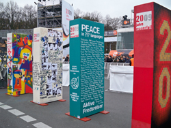 Initiativet til å dekorere steiner ble tatt av Aktive Fredsreiser. De symbolske steinene er 2.5 meter høye, og var blant 1000 steiner i dominofallet som symboliserte murens fall under markeringen i Berlin i 2009.