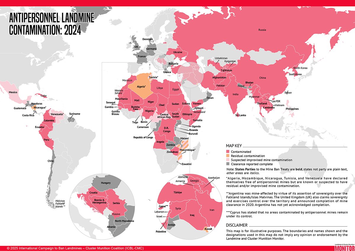Kart: © International Campaign to Ban Landmines, Landmine Monitor 2025